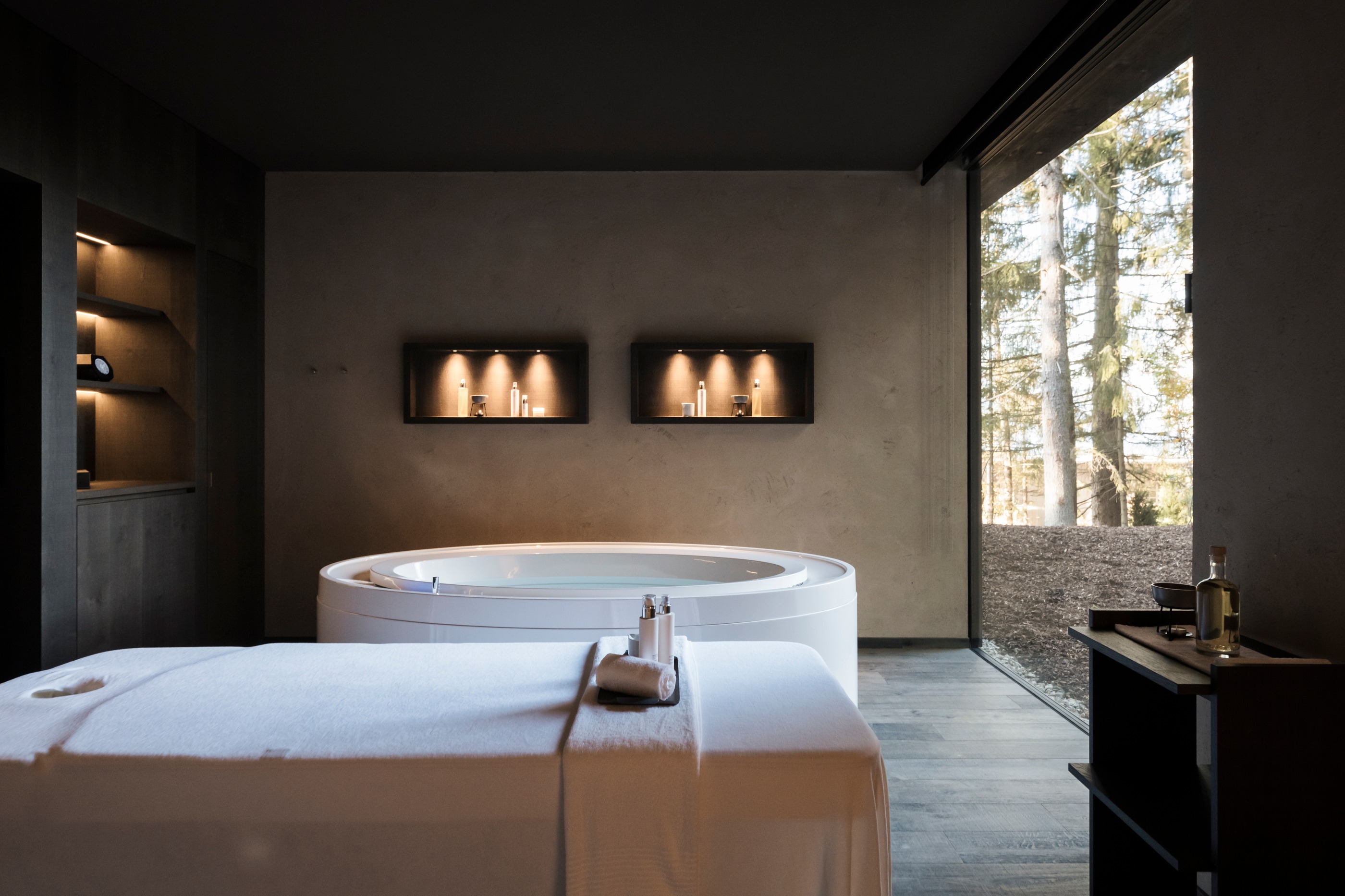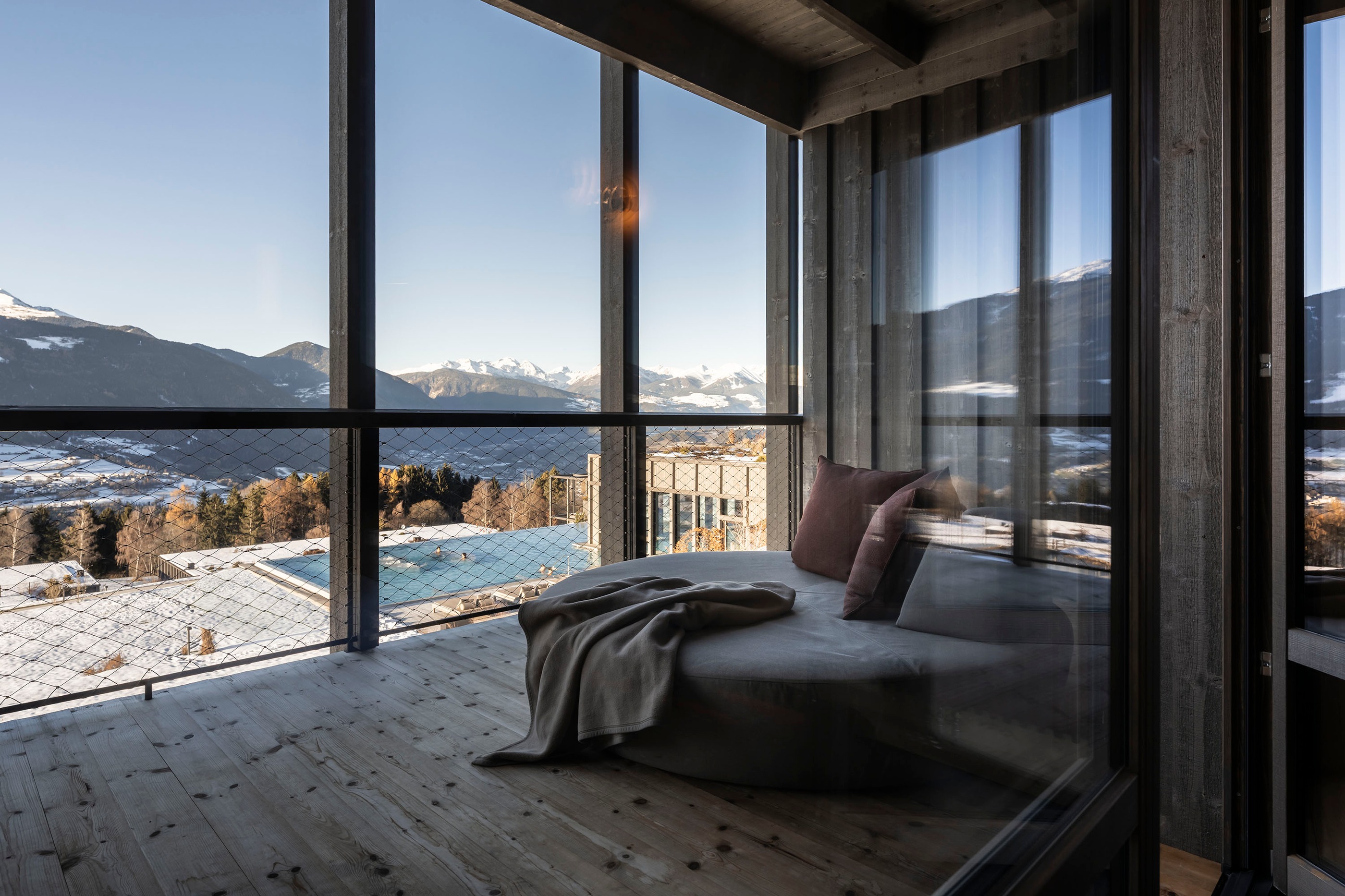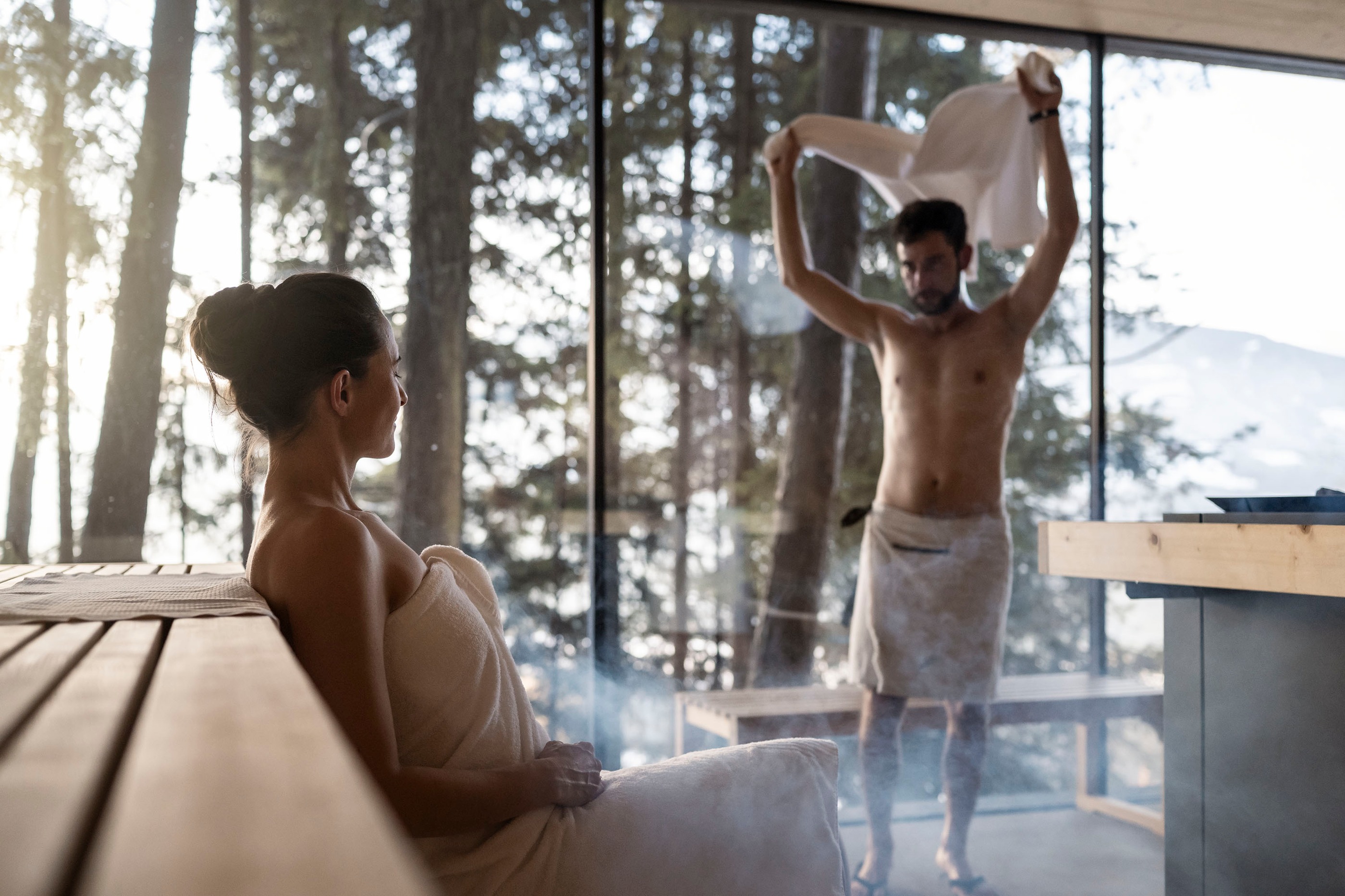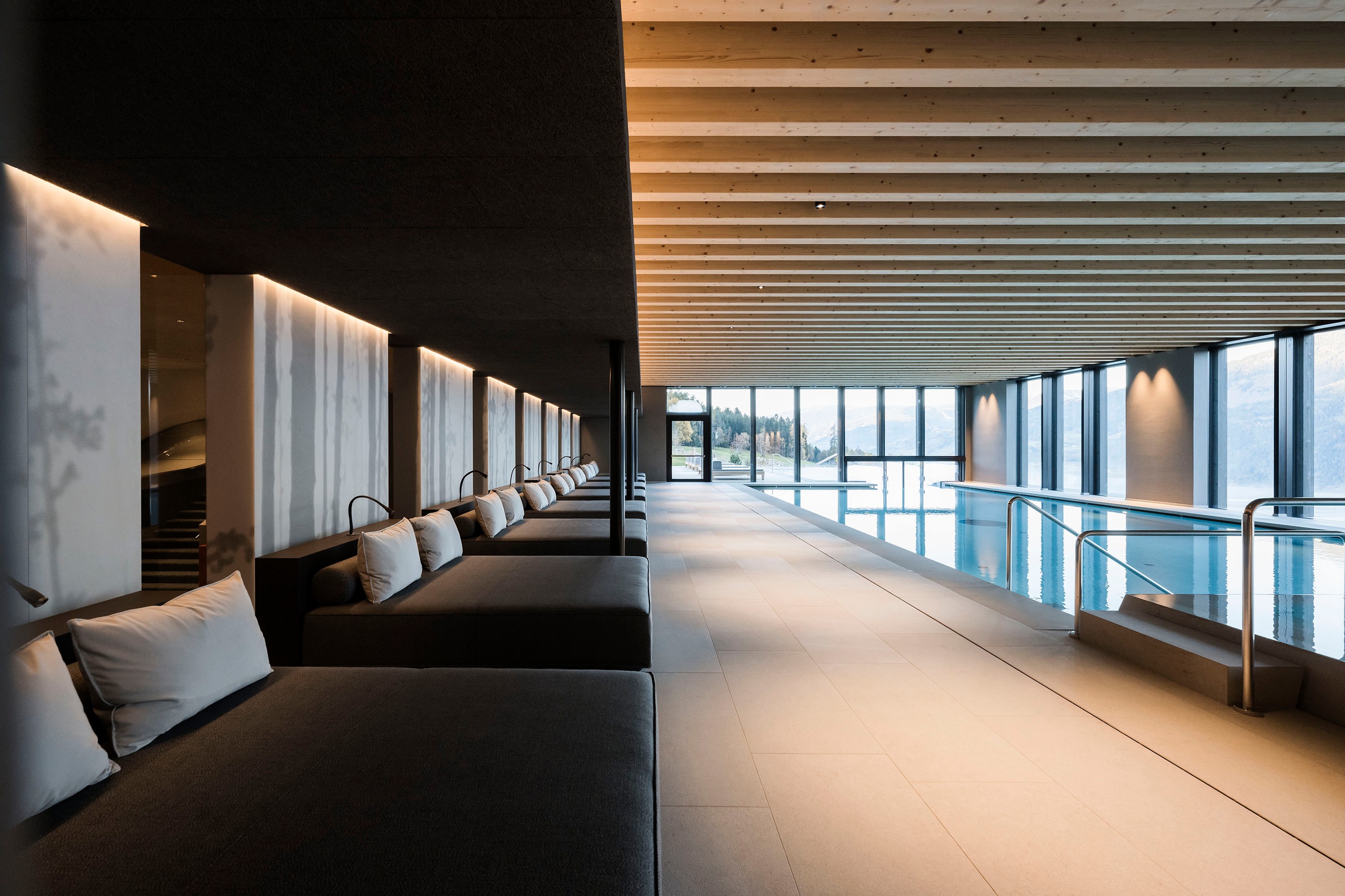 Mentre i bambini si divertono in acqua, i genitori si rilassano nella spa immersa nel bosco: saune panoramiche, padiglione yoga e trattamenti ADLER tra silenziosi abeti.