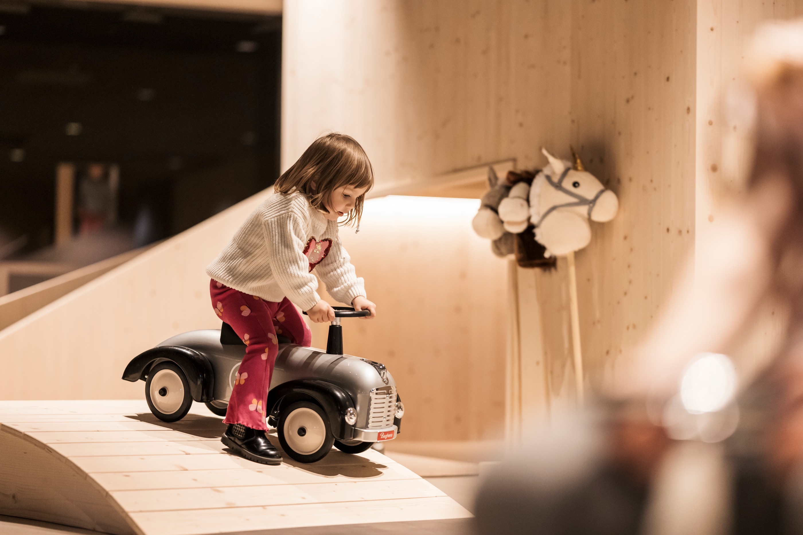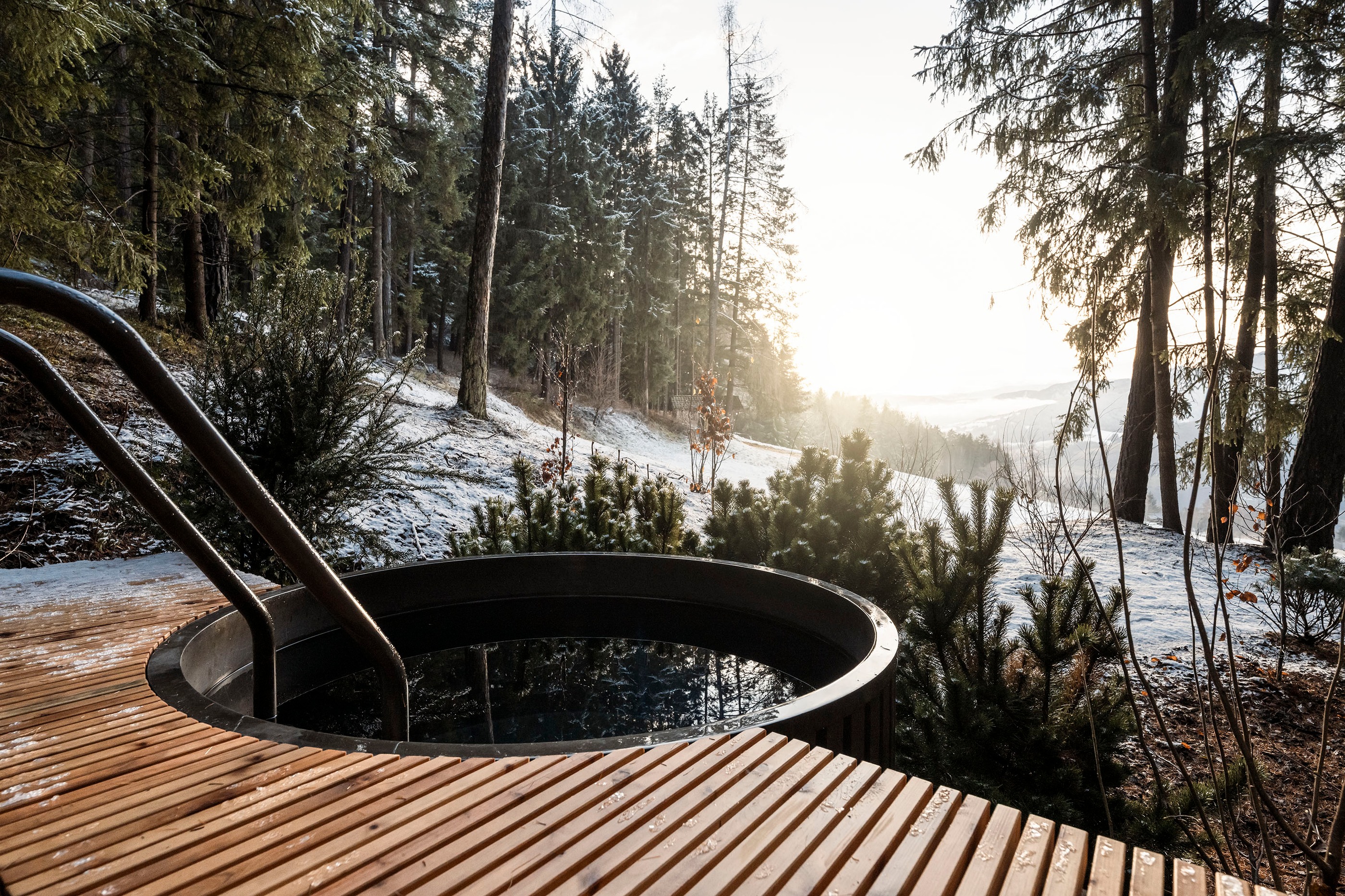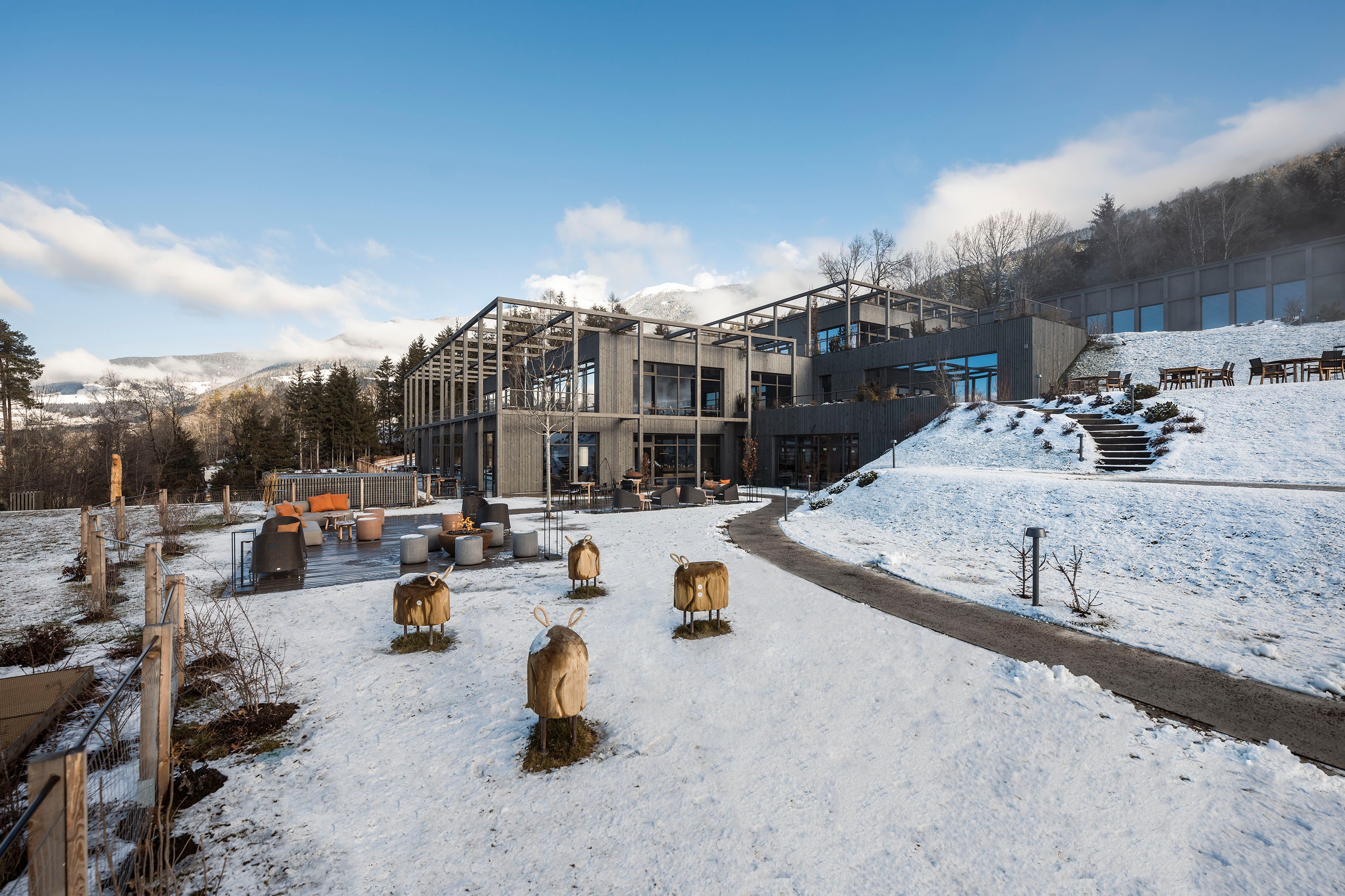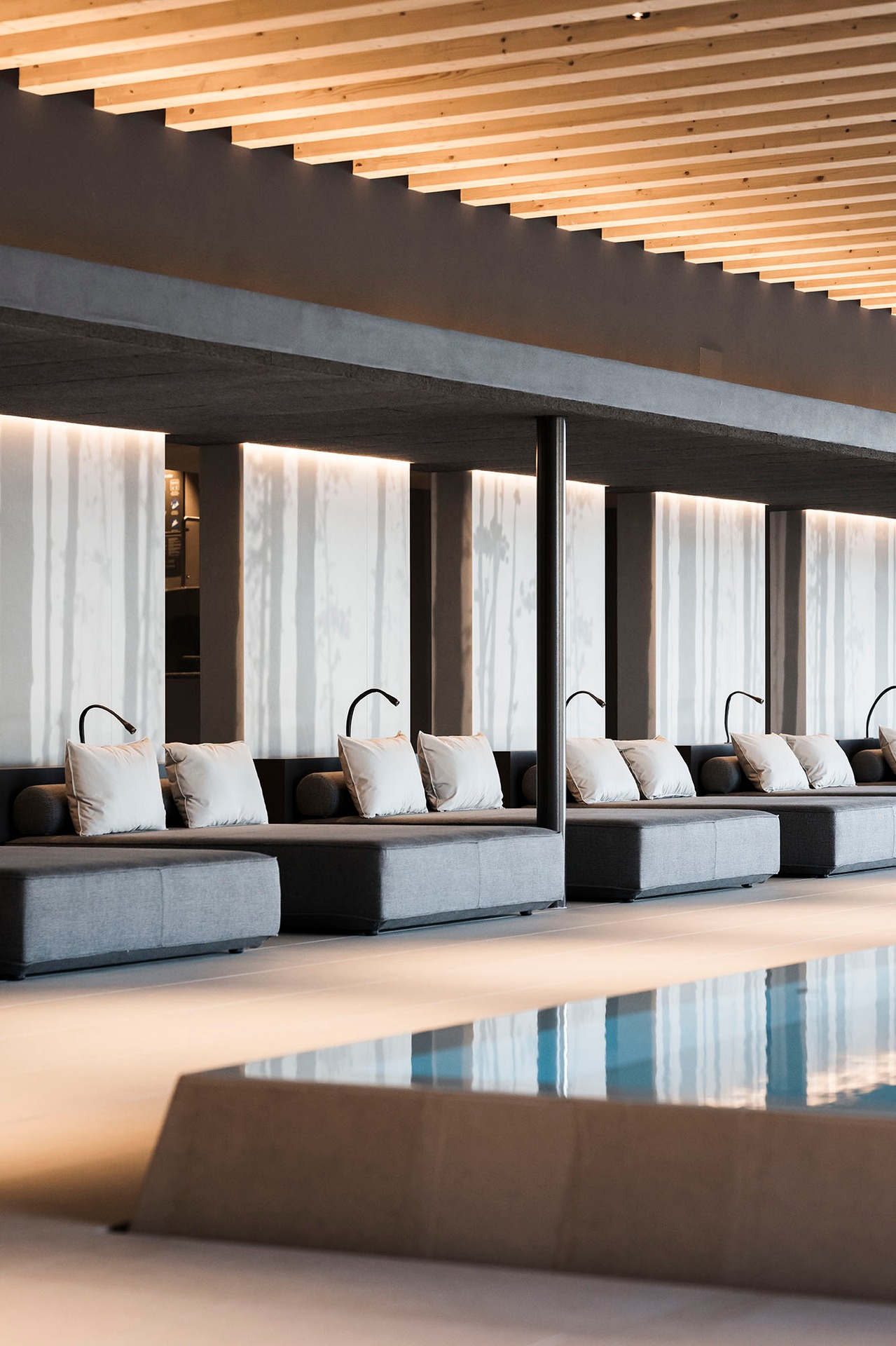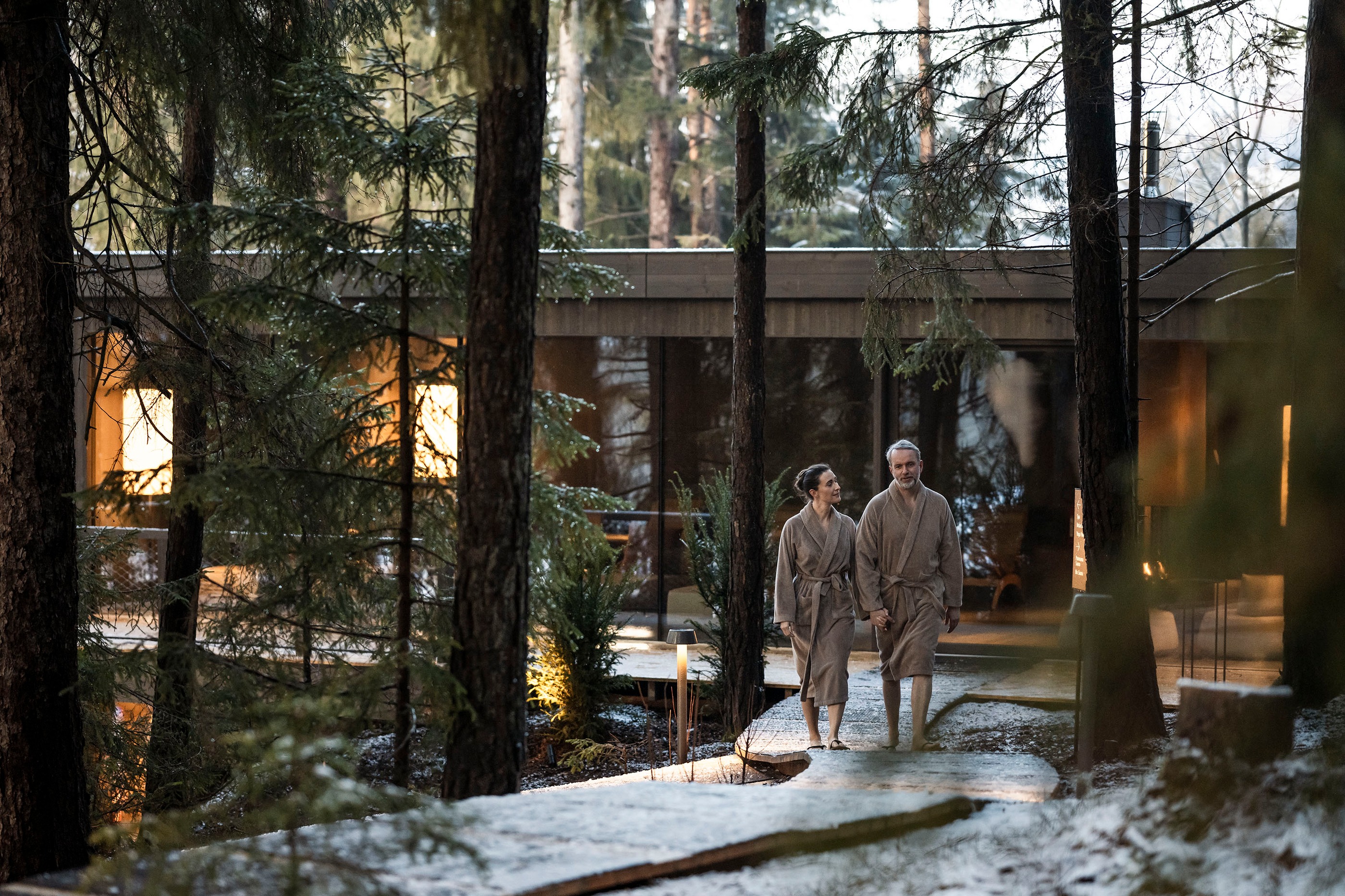 Mentre i bambini si divertono in acqua, i genitori si rilassano nella spa immersa nel bosco: saune panoramiche, padiglione yoga e trattamenti ADLER tra silenziosi abeti.